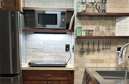 This self-contained, separate apartment is the ground floor of our home. With tons of light and a fully-stocked kitchenette, this space was completely remodeled in 2023 with high end finishes, plenty of storage, comfortable seating, and a bedroom with gorgeous views through floor to ceiling windows.