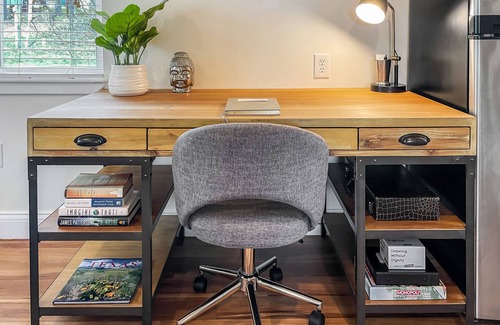 Our Colorful Artistic Cabin features its own small, open yard space, complete with a fire table and chairs, a charcoal grill, and a bar table with stools. It also has parking for up to two vehicles and potential parking for truck and boat trailers. This is a quiet and safe residential neighborhood.