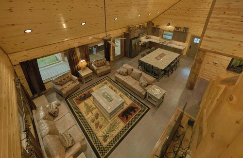 The Adventure Lodge, a stunning cabin, comfortably sleeps 12 people, featuring four luxurious king-sized beds, four baths, and a range of enticing amenities. Nestled within just 5 miles from Pigeon Forge and Gatlinburg, it offers an ideal blend of accessibility and seclusion, featuring an indoor pool, movie theater, hot tub, pool table, and fire pit. Its setting provides a serene atmosphere with wooded views visible through several oversized picture windows that artfully capture the natural beauty of the surroundings. Adventure Lodge caters to outdoor enthusiasts with various activities, including a yard, outdoor dart game, horseshoes, and fire pits, all complemented by expansive covered decks and stacked stone wood-burning fireplaces. This charming retreat is conveniently situated in a flat area, eliminating the challenge of navigating mountain roads. Vibrant with energy, the space is perfect for kids, offering opportunities for bike rides and leisurely strolls after dinner. For larger groups, an identical sister property, "Livin It Up," is situated across the street, allowing accommodations to be expanded for a total of 24 guests when both properties are rented simultaneously.