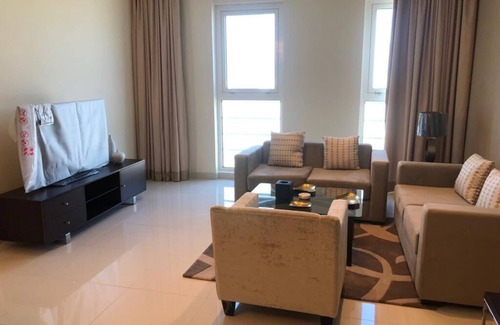 lavish apartment with luxury living style ,fully furnished with comfortable cozy beds and sofa, nicely decorated living room with plasma tv and sound system, big kitchen with kitchenette ,microwave ,dishwasher.