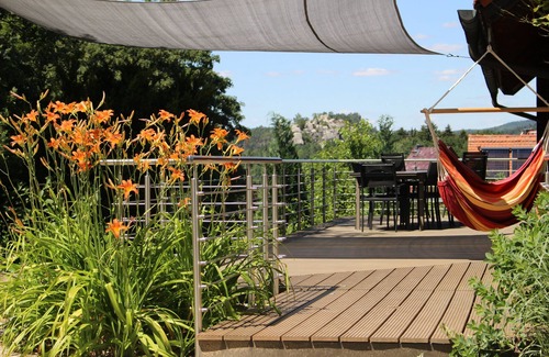 Large wooden house with a surrounding terrace, sauna and play island, in the heart of the Elbe Sandstone Mountains, ideal for hikers, toddler equipment available