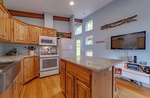 Nestled on the rugged cliffs of Northern California's breathtaking coastline, Spruce Creek Cottage is a luxurious retreat that seamlessly blends rustic charm with modern elegance. Located just outside the charming town of Trinidad, this intimate one-bedroom cottage offers peek-a-boo ocean views and an abundance of natural light that fills the space, thanks to soaring vaulted ceilings. It's the perfect sanctuary for relaxation and rejuvenation. From the fully stocked kitchen to the cozy living room, you'll enjoy the bliss of a serene, forested setting perched above wide-open bluffs—ideal for taking in spectacular ocean views and unforgettable sunsets.