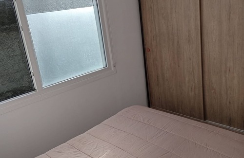 Tiene dos habitaciones; una con una cama doble y un amplio placard, y otra con una cama simple y una cómoda. También en el living hay un sofá cama (es sólo apto para niños, no creo que un adulto se sienta cómodo en él). Si son 4 huéspedes adultos pueden pedirnos un colchón extra para mayor comodidad.