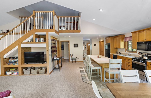 Beautiful contemporary chalet w/ 3 bedrooms and a sleeping loft. Comfortably sleeps 10 people. 2.5 bathrooms & washer/dryer on the main floor. Enjoy a large open living room on the main floor & a cozy family room on the first floor with a pool table. Unwind on the front deck or fire up the grill! Central A/C.