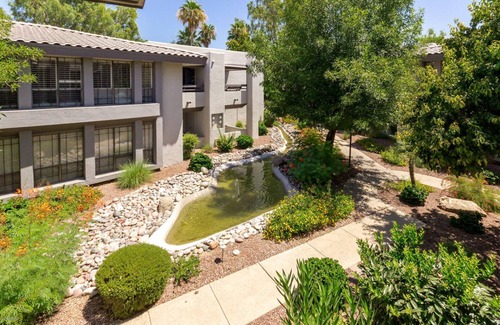 Professionally designed and ready for your amazing vacation. Modern and welcoming. Walk in and immediately feel the open floor plan, high end finishes and amazing Arizona light. Fully stocked kitchen, all linens, towels, pool towels, etc provided. This condo has it ALL and is in the perfect location and in a development that has everything: tennis courts, two pools, gym, club house, security guard, covering parking, dry sauna, walking paths and meticulous landscaping. Situated between a beautiful golf course and Biltmore Fashion Square. You can walk to some of very best restaurants and shopping Phoenix has to offer.