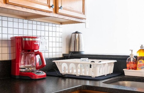 The kitchen has an electric stove, microwave, toaster, coffee maker, electric kettle, and a fridge.
