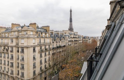 Once you enter in this apartment, you are welcomed by a luminous living room that has a dining table for four people and a large sofa. From the two small balconies, you can take in the amazing view of the Eiffel tower whilst enjoying a nice glass of wine.
