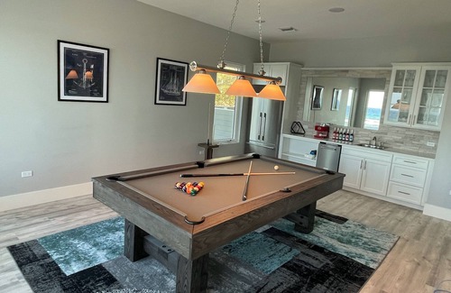 The centerpiece of the upstairs, however, is the oversized entertainment room. Sleeping 3-6 comfortably (if needed) with triple bunk beds, the upstairs entertainment room also contains an array of options for kids (or adults!) of all ages. Try your luck at Skee-ball, or challenge a friend to a game of pop a shot basketball. There is also air hockey, ping pong, and bubble hockey, as well as a 75 inch TV. The entertainment room is equipped with an array of board games to enjoy as well.
