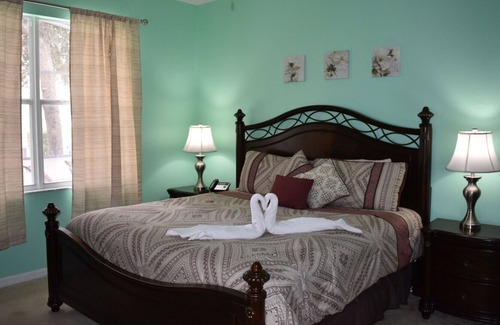 This delightful home provides beautifully furnished 4-bedroom (2 master suites), 3-bathroom accommodation with its own private screened pool & Jacuzzi (heating available at additional fee) occupying a beautiful south facing sunny corner with views across an open grassed space providing great privacy. This home is located in the guard/gated community of Calabay Park at Tower Lake, a small, peaceful community set well back from any main road traffic. Walt Disney World® Resort is a short 18 minute drive away. This home has a maximum sleeping capacity of 10. There is ample kitchen equipment, microwave, refrigerator-freezer, range, washer and drier, towels, linens etc. The family room has a flat-screen TV, and all bedrooms are equipped with their own TVs. There is a highchair and pack'n play provided. The home is also set up with Wireless Internet. This is a non-smoking and pet-free home.
