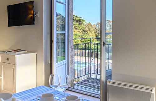"Le Château de Kergonano", 2-room apartment 35 m2 on 1st floor. Comfortable and beautiful furnishings: living/sleeping room with 1 double sofabed (2 x 80 cm, length 190 cm), dining table and TV (flat screen). Exit to the terrace. 1 room with 1 french bed. Kitchenette (dishwasher, 2 ceramic glass hob hotplates, kettle, microwave, electric coffee machine). Shower/WC. Electric heating. Small balcony. View of the swimming pool and the garden. Facilities: Internet (WiFi, extra). Reserved parking. Please note: non-smokers only. 1 pet/ dog allowed. Smoke alarm, fire extinguisher. Daily cleaning and change of linen possible on request and at extra cost. Offer by a private individual according to Art. 155, IV of CGI.