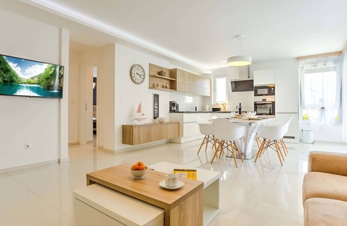 Vila ViD is a modern apartment house built in 2016, situated in a sunny location just 200 meters from the sea and beach in Vantačići, 3 km from Malinska, Rijeka, Croatia. The property boasts a private heated swimming pool (seasonal availability from May 1st to October 15th) with a salt-electrolysis cleaning system, outdoor shower, and barbecue area. Additionally, it offers internet WiFi access and parking facilities on the premises. Your holiday rental experience will be enhanced by these exceptional amenities.