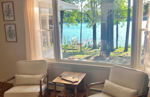 Our hidden gem awaits you! Enjoy the spring fed crystal clear water, with sandy shoreline, on full recreational lake, Stratton Lake. Enjoy your day fishing, swimming, jumping off the swim raft, skiing, tubing or boating followed by stunning sunset views and campfires at night. Kayaks, paddleboards, and paddle boat available for use or bring your own boat and tie off on our dock. Located minutes away from shops, historical sites, grocery stores, entertainment, attractions, restaurants, Hartman's Creek State Park, and the Chain O' Lakes. The cottage features a large living room with stunning lake views and a pull out queen sofa bed. There is a king bed in main bedroom, two full beds in second bedroom. Enjoy the view in our 4 seasons lake view room, full bathroom, kitchen and outside dining area with gas grill as well as an outdoor shower. Minimal slope provides an easy stroll to the waters sandy bottom shore and dock. There is a public boat landing on W. Stratton Lake Road to launch your boat. The perfect location for your lakeside get-away to relax and make memories! There is room for two vehicles in our drive way otherwise side road parking is an option if you have a vehicle with trailer. Onsite firewood is available for purchase. We have a Maui mat available for rent as well.