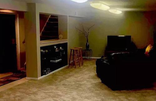 The back yard boarders a golf course which offers a park like setting. It’s peaceful here. The house is clean and updated. It’s free of clutter. It has four bedrooms one of which is an office. There is a finished basement with a large area with television and comfortable seating. There is a bedroom in the basement. There’s also a new washer and dryer for guest to use.
