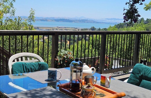 Sitting atop the Bret Harte Ridge overlooking the San Francisco Bay, this home is located in a great, quiet neighborhood on a country road yet close to all the attractions of Marin County. Wake up with the morning sun flooding your bedroom and enjoy a cup of coffee or tea on a private deck with spectacular all-around views. Very walkable level street with custom built homes ends with a trail to Old Redwoods. Neighbors' houses are far enough that you barely notice them.