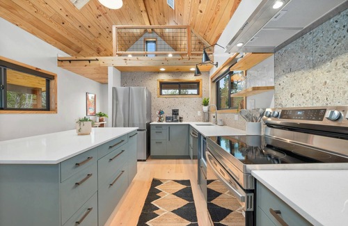 An outdoor shower for washing off after a long day of relaxing. A large hot tub to accommodate your party of 4. A full kitchen with refrigerator/freezer, full sized dish washer and range/oven.