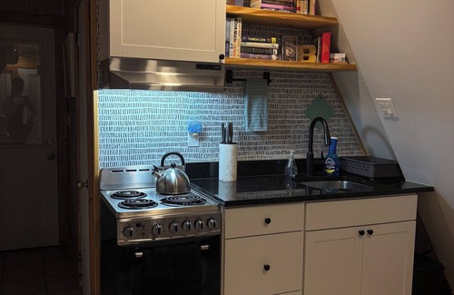 You have a well-appointed kitchen that makes good use of the space. We provide most of the utensils, dishes, cups, glasses, and pots and pans you may need. There are two mini fridges, one with a small freezer, and a separate ice maker, as well as a Keurig, kettle, toaster, and mini waffle and pancake makers. You can bake all sorts of goodies in the mini-stove - our pans fit perfectly. We also provide spices, oil, tea, k-cups, creamer, and a few other provisions.
