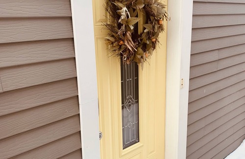 Access the suite through a shared side door entrance (key code entry), with stairs down to the private suite.