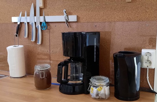 Some filter coffee and filters for the first cups of coffee, tea bags, sugar, a few tubs of coffee milk, salt and pepper and some dried herbs. dishwashing liquid, cleaning wipes, dishwashing brush, kitchen roll and drying cloth.