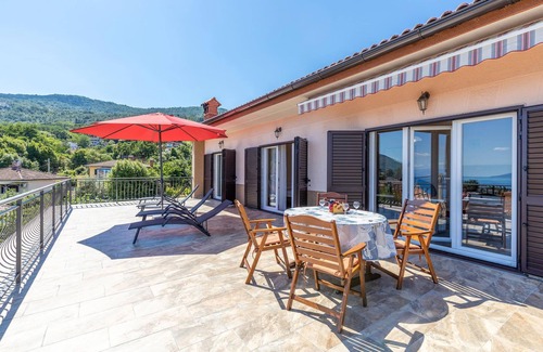 Cozy apartment in a family house, accessible via an external staircase. It includes two bedrooms, a kitchen with dining area and a spacious terrace with panoramic views. Nearby are several well-known travel destinations, where you can visit cultural and historical attractions in the summer, as well as numerous entertainment events. Start the day with the first cup of coffee in one of the seaside cafes and then sunbathe on one of the beaches in Moscenicka Draga, Medveja or Brsec. At the end of the day, enjoy a romantic walk along the famous beach promenade Lungo Mare, which connects the towns of Opatija and Volosko.