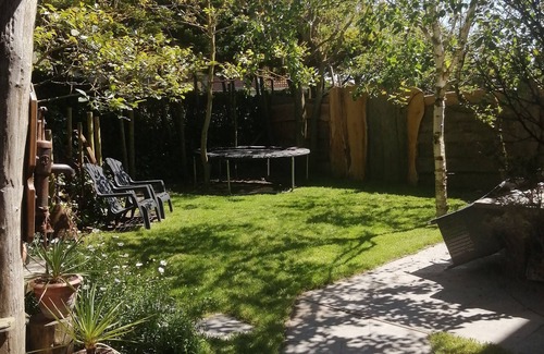 Garden with many trees and birds, terrace, BBQ and trampoline for children.