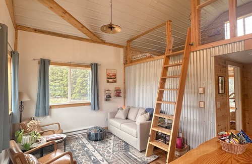 Halfway across the cabin, there is a loft accessible via ladder, with four camp-style twin beds, ample room for activities such as yoga, and a great additional hang out space. The window opens toward the babbling brook for great sleep music. Under the loft is the master bedroom, with wonderful mountain, canyon, and sky views and a full bathroom.