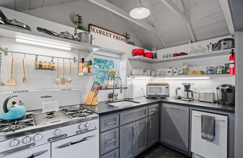 In the delightful town of Julian lies a snug two-bedroom cabin, ideal for your upcoming getaway. Old world meets new world in this remodeled cozy cabin. As you step inside, you'll be greeted by a warm and inviting atmosphere, complete with a crackling wood stove and a smart TV for your entertainment. The fully stocked kitchen, equipped with a 5 burner gas stove, oven, refrigerator, and all the necessary appliances, allows you to whip up delicious meals during your stay. Enjoy your culinary creations at the dining table, or step outside and fire up the grill for an alfresco dining experience.