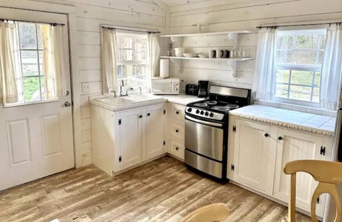 This studio cottage offers open one room studio style floorpan- Queen size bed with window overlooking the creek, Living area with Lazy-boy sleeper sofa. Charming kitchen with fridge, stove, Keurig and microwave. Private bathroom with stand-up shower. This unit sits next to the rippling Brushy Creek, listen to the sounds of nature and unwind.