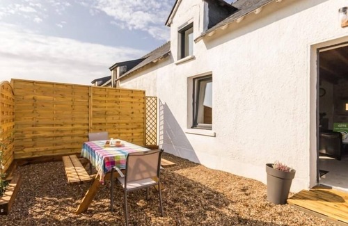 Ideally located between the Medieval Town of Guérande, La Turballe, Piriac-sur-Mer, La Baule, and the Brière Regional Park, both in the countryside and not far from the sea (3 km), the Kerhouanne cottage is a traditional semi-detached house, renovated in the traditional style with all modern comforts. It is close to the owners' dairy farm, with tours available upon request. Private enclosed outdoor space of 400 m² with a south-facing terrace. Available amenities: pétanque, molkky, and a chicken coop for collecting eggs in season.