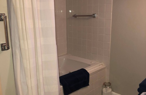 The guest suite has a private entrance and is on the lower level. There’s a large room with sleeping area, living space, cafe table, and a full bath with jacuzzi tub. With a queen bed and sofa bed, it comfortably sleeps three guests. (A portable crib is available upon request.) It includes a mini fridge/freezer, microwave, drip coffee maker, & kettle; no full kitchen. You’ll have access to a shared back yard and off street parking in the driveway.