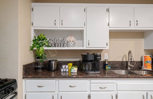 - Kitchen: Coffee maker, K-cup coffee machine, toaster, oven, microwave, fridge, dishwasher, cookware, dishes, glassware, utensils, oil, salts, and peppers.
