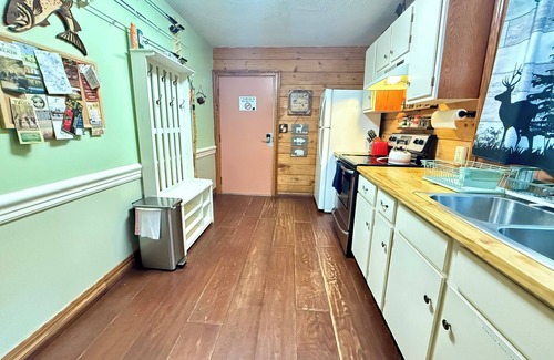 Unplug beneath a canopy of trees, where forest views surround you and wildlife often wanders by. Kick back on the covered deck with your morning coffee, gather around the firepit under the stars, or curl up beside the wood-burning stove with a good book or movie. Rain or shine, The Lincoln delivers cozy vibes and unforgettable memories.