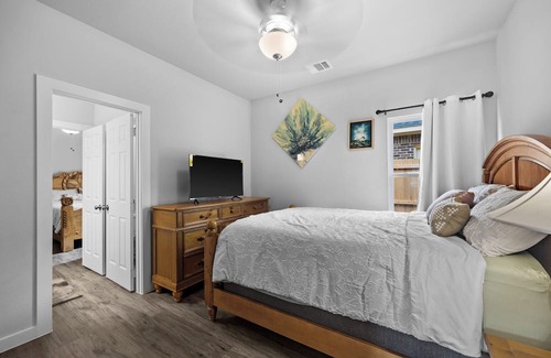 - Four Comfortable Bedrooms: Each bedroom is designed with comfort in mind, spacious closets, and large windows. The master suite includes a walk-in closet and a luxurious en-suite bathroom with dual sinks, a soaking tub, and a shower. Each bedroom has a new smart TV for you to kick back and stream all of your favorite shows!