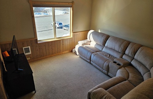 As you enter the unit you will find an open, updated kitchen with a dining table large enough for 8 guests. The kitchen is fully furnished with quality appliances and accessories ready to make your own meals. In addition, there is a bathroom/drying room adjacent to the kitchen with a large boot (8 pair) dryer. Around the corner from the dining area there is a living room equipped with a flat screen TV and comfortable sectional couch perfect for relaxing after a day of skiing, hiking or mountain biking.
