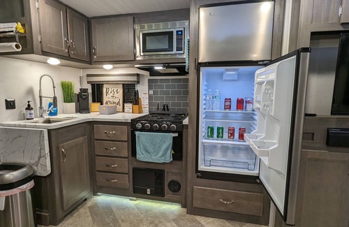 Your Acworth adventure begins at this 1-bedroom recreational vehicle. Nestled in a nice and pleasant setting, this property offers a cozy retreat for guests. The bedroom features a comfortable RV custom king bed, ensuring a restful night's sleep. With amenities like heating, AC, WiFi, 2 Roku enabled flat screen TV’s, board games, toys, a seasonal hot tub and fire pit your stay will be convenient and enjoyable. The bathroom is equipped with a hair dryer, towels, toiletries and shower. Additionally, there is a living room, including a sofa bed and a bunk bed. A fully stocked kitchen with dinette table for 4 and a Keurig coffee maker (coffee pods provided). Our place is equipped for both long or short stays to make your holiday one to remember. This RV is located on our property where our family lives full-time. Located less than 3 miles from I-75, just a short drive to local stores, restaurants, Lake Allatoona, Red Top Mountain State Park, LakePoint Station and many other attractions.
