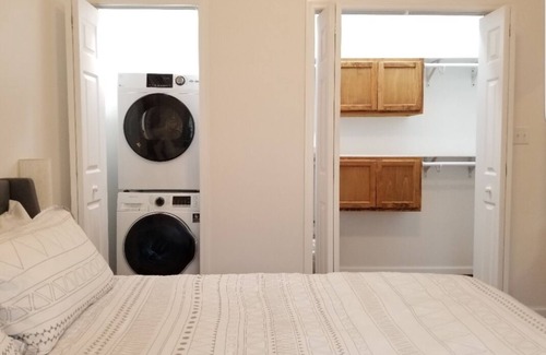 Sleep comfortably on a brand-new Queen Zinus mattress with clean sheets and bedding, side tables, touch lamps with charging ports. Fall asleep watching Amazon FireStick TV. There is plenty of storage in the bedroom closet and under the bed to unpack your luggage and settle in for your stay. A full length mirror, iron and ironing broad are provided so you can look your best when attending events or meeting family and friends.