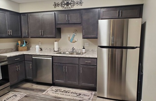 Beautiful renovated lake house with two 40 ft decks that overlook the lake. Three bedroom with two bath. Sleeps 7 in beds and also has a queen air mattress and a cot. Huge sliding glass doors leading out to the decks from each bedroom overlooking the lake. An electronic reclining sectional. Grilling and fish fry station. Beautiful boat dock with a slip providing amazing views of the sunset. Sun loungers and outdoor dining. Fully equipped kitchen with everything you may need for cooking. Highlights in the kitchen include plastic and glassware, barware, blender, toaster, crock pot and much more. Splendid fully equipped coffee bar! Full-size washer and dryer. Mini refrigerator on the first floor. Beautiful fireplace. Bath towels and all linens and cozy blankets provided. Beach towels also available. Amazing fishing and a few poles provided. Our home is in a gorgeous no wake cove, providing plenty of relaxation and fun on the lake. Lots of restaurants, wineries and bars nearby. Huge water park only 2 miles down the road