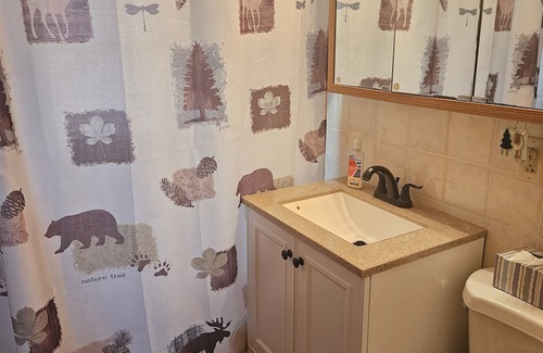 Park up top by the garage or head down the driveway to park right by the door. Take the small set of stairs to enter and you will find the main living space to the right and the third bedroom to your left. The living room has cable and a smart TV. A wood burning fireplace is ready for the cooler nights; make sure to stop in town for firewood. Our kitchen is fully stocked for most of your cooking needs with some extras too: air fryer, pizza pizzazz, crock pot, and single serve coffee maker. You will find the charcoal grill outside with a chimney for an easy way to fire it up. The bathroom has a shower and tub combo; a potty training seat and step stool are available for your littles. Towels are included but please bring your own beach towels. The main bedroom has a king size bed, smart TV, closet with a dresser and a glimpse of the lake from the window. The second bedroom has a twin over full bunk bed with the top bunk only supporting 100lbs. You will find a dresser in there with a TV and Blu-ray player. The third bedroom has a queen size bed, smart TV, and shelving for your belongings. As you exit you will need to take a set of stairs to access the water. The dock has room to tie up your boat and our boathouse has a pedal boat with a few life jackets available. Bring your fishing gear to store in the boathouse too.