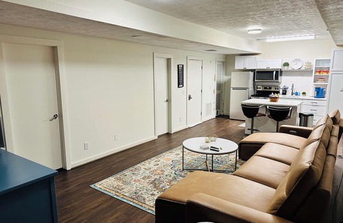 Cute and spacious one bedroom basement apartment with private entrance in a family neighborhood home. LVP floors throughout, a kitchenette with a mini-refrigerator, microwave and coffee machine (not a full kitchen) A bedroom with a queen and twin bed, and to top it all, it features a projector in the living room. A deck with a firepit table and 4 chairs with a view to a beautiful creek.