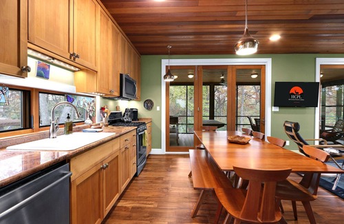 The kitchen, a true show-stopper, boasts a chic and modern look with stainless steel appliances, rich wood cabinetry, and shiplap-style ceilings. Share a meal in the dining room while enjoying the breathtaking views that this room overlooks. An inviting screened-in porch off the living space provides the ideal spot to savor a morning cup of coffee or a favorite beverage, all while immersing yourself in the sights and sounds of the flowing creek.