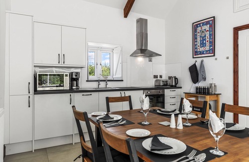 There is a modern spacious kitchen, with exposed beams and vaulted ceiling. The kitchen has all mod cons including a dishwasher, microwave, filter coffee machine and all the items that you can expect to be able to rustle up a family meal. Also benefiting from a dining table and chairs, and high chair for use.