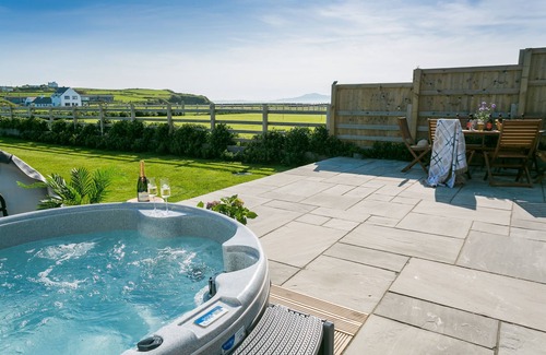 Outside, the patio has dining furniture, a gas BBQ and a 4-5 person hot tub. Beyond is a large, enclosed garden which beyond the gates at the bottom, leads out to a private pathway to the sandy beach which can be directly accessed via steps, alternatively, from the front of the cottage, you can access the beach via the road which is on one level. To the front of Cysgod y Llanw, there is plenty of private parking on the gravelled driveway.