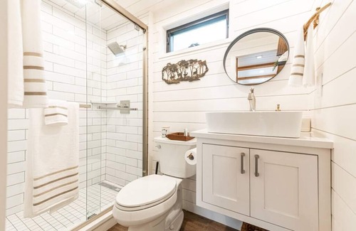 This tiny house has all the amenities of an upscale hotel room yet with unique and exquisite design and decor. A queen size bed with a super-comfy Tuft & Needle mattress will help you fall asleep fast. A full size shower and bathroom is snuggled into the back of the unit and has endless hot water! For your morning coffee a Keurig and K-cups are provided along with a microwave for heating up your popcorn in the evening. Climb up to the rooftop deck for stargazing or your morning coffee.