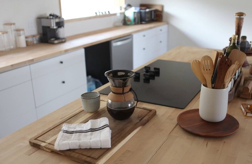• refrigerator/freezer, stove (electric), pour over and espresso coffee maker, convection and toaster oven.