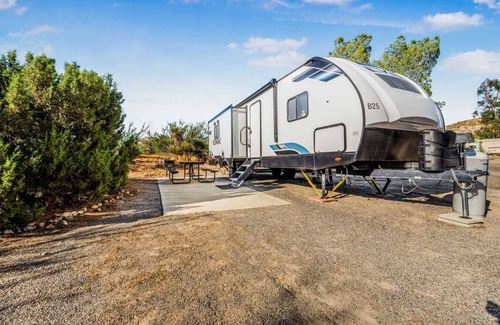 Experience unparalleled comfort in our Travel Trailer, perfectly situated for breathtaking views of Temple Peak and Jacumba Mountain, with mesmerizing sunset vistas. Enjoy the authentic RV camping experience with a plush queen-size bed, TV, coffee maker, refrigerator, and private bathroom with shower, offering all necessary modern conveniences. Our resort’s well-maintained grounds and stunning natural scenery create the ideal backdrop for relaxation. From tranquil strolls to lively gatherings, immerse yourself in nature's beauty without sacrificing the comforts of home.