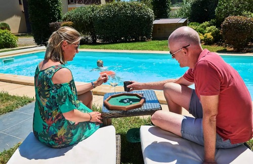 Accommodation: The exclusive villa Margaux Deluxe for eight people (160m2) with private heated pool, open from the third week of April to the first week of October. In the large garden with privacy, children have many possibilities to play. Luxurious garden furniture with deckchairs is available on the covered terrace so you can enjoy the French summer sun. The living room is elegantly furnished with a fireplace and a TV with international channels. The princes or princesses of the kitchen can have fun in the open kitchen with a design cooking island that is equipped with integrated luxury appliances such as a hob, refrigerator with freezer compartment, dishwasher, oven and microwave. On the ground floor is also the spacious master bedroom with en suite bathroom with bathtub, shower and double sink. On the first floor are three bedrooms. A bedroom with en suite bathroom with bathtub, shower and double sink. The other two bedrooms can share the third separate bathroom, which has a shower cabin and a double sink. There's a second separate toilet.