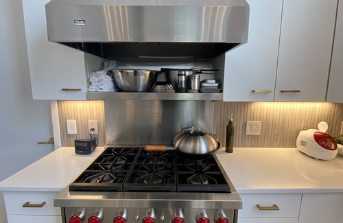 Primary first floor bedroom has a new king size bed, dresser, walk-in closet, window seat, 55" smart TV, brand new private bathroom with tub, shower and heated bidet. Second first-floor cozy bedroom has a queen pull-out couch.