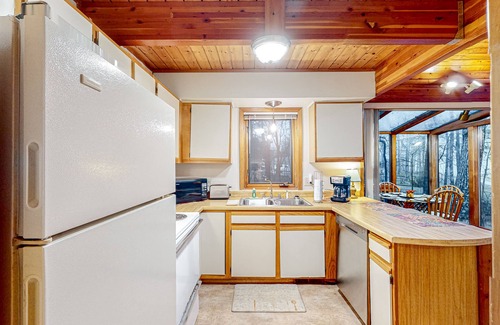 You're sure to love all this A-frame abode has to offer, including a kitchen with breakfast bar seating, a sunroom, and a cozy fireplace in the living area. The space boasts a fantastic location and all the comforts of home, including uniquely outfitted bedrooms, smart TVs, and a washer/dryer.