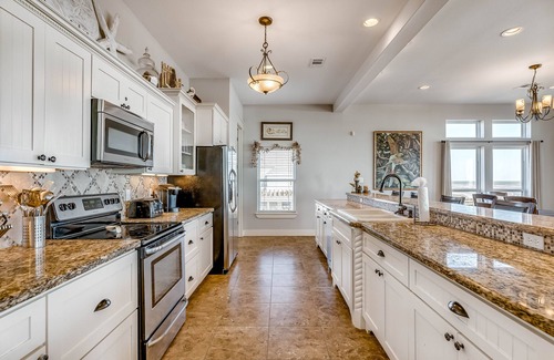 With plenty of room for an extended family or large travel group, this exquisite, beachfront home is sure to be the repeat vacation location. Offering jaw-dropping, panoramic views, coastal chic touches, and plenty of space for everyone to spread out and relax, this home is a Galveston paradise. Prepare full-course meals in the bright, full kitchen while watching the pelicans pass by. Dine together at the large table with seating for 10, with overflow seating at the island, and then gather in the open living area for socializing or movie nights. Outside, you'll find an enormous, fully-furnished covered deck, an upper-level balcony, and a lower level with plenty of picnic tables for warm-weather cookouts. For sleeping arrangements, this home features four comfortable bedrooms ranging from elegant king suites to a kid-friendly space with built-in bunks.