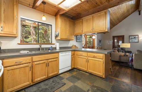 Enter the home via pathway from the parking area. A few steps up and you'll enter through a closed off mud room-the perfect place to store shoes and jackets. From the mudroom, you'll step into the main living space. Recently remodeled and professionally decorated, the finishes are gorgeous-with contrasting textures and comfy, mountain modern finishes throughout. Highlights include hand scraped, rich hard wood floors, a cozy dining nook and a warm and inviting stone back drop behind the wood stove. The kitchen offers stone flooring and countertops and an open breakfast bar.