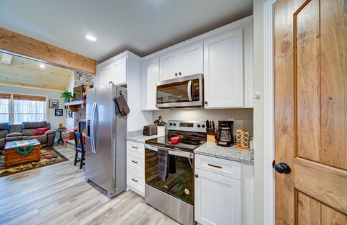 The home's beautiful open-concept interior features a living area with a wood-paneled vaulted ceiling and a stone gas fireplace perfect for when you want to set the sofas to recline and cuddle up with a blanket. The bright, country decor sets the tone throughout the house. Prepare home-cooked meals for your friends and family in the full kitchen; the central AC will keep you cool. Conveniently, there's also a private washer/dryer so you can pack light and high-speed Fiber internet for uninterrupted video calls.